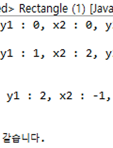 다음과 같은 멤버를 가지는 직사각형을 표현하는 Rectangle 클래스를 작성하라. ● int 타입의 x1, y1, x2, y2 필드 : 사각형을 구성하는 두 점의 좌표● 생성자 2개 : 디폴트 생성자와 x1, y1, x2, y2의 값을 설정하는 생성자● void set(int x1, int y1, int x2, int y2) : x1, y1, x2, y2 좌표 설정● int square() : 사각형 넓이 리턴● void show() : 좌표와 넓이 등 직사각형 정보의 화면 출력● boolean equals(Rectangle r) : 인자로 전달된 객체 r과 현 객체가 동일한 직사각형이면 true 리턴 Rectangle을 이용한 main() 메소드는 다음과 같으며 이 main() 메소드가 잘 작동하도록..