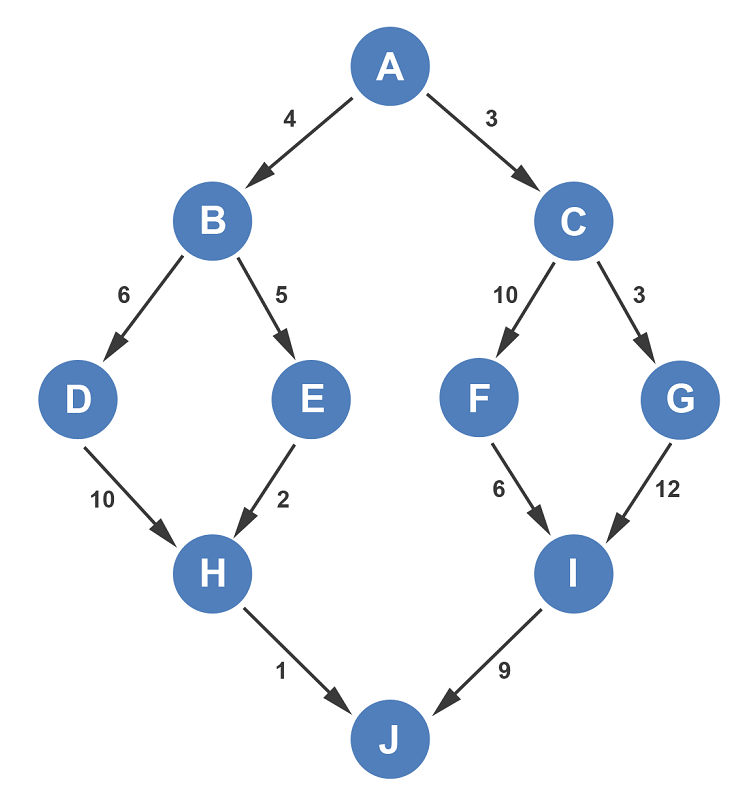 최단 경로를 찾기 위해 그리디 알고리즘을 사용하여 결과를 얻는다면, A-C-G-I-J(19)의 결과가 나올 것이다. 하지만 위 알고리즘에서 최적의 해는 A-B-E-H-J(12)이다.