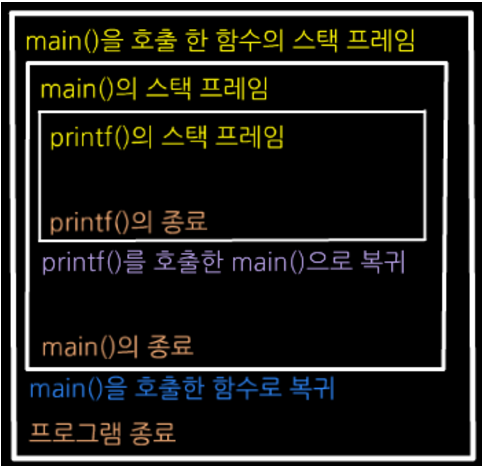 main()이라는 함수가 호출 되고 그 다음에 printf()라는 함수가 호출 된다.