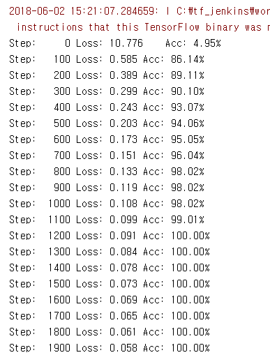 1 2 3 4 5 6 7 8 9 10 11 12 13 14 15 16 17 18 19 20 21 22 23 24 25 26 27 28 29 30 31 32 33 34 35 36 37 38 39 40 41 42 43 44 45 | import tensorflow as tf import numpy as np xy = np.loadtxt('data-04-zoo.csv', delimiter=',', dtype=np.float32) x_data = xy[:, 0:-1] y_data = xy[:, [-1]] nb_classes = 7 X = tf.placeholder(tf.float32, [None, 16]) Y = tf.placeholder(tf.int32, [None, 1]) Y_one_hot = tf.one_hot(Y, nb_classes) print("ont_hot", Y_one_hot) Y_one_hot = tf.reshape(Y_one_hot, [-1, nb_classes]) print("reshape", Y_one_hot) W = tf.Variable(tf.random_normal([16, nb_classes]), name='weight') b = tf.Variable(tf.random_normal([nb_classes]), name='bias') logits = tf.matmul(X, W) + b hypothesis = tf.nn.softmax(logits) cost_i = tf.nn.softmax_cross_entropy_with_logits(logits=logits, labels=Y_one_hot) cost = tf.reduce_mean(cost_i) optimizer = tf.train.GradientDescentOptimizer(learning_rate=0.1).minimize(cost) prediction = tf.argmax(hypothesis, 1) correct_prediction = tf.equal(prediction, tf.argmax(Y_one_hot, 1)) accuracy = tf.reduce_mean(tf.cast(correct_prediction, tf.float32)) with tf.Session() as sess: sess.run(tf.global_variables_initializer()) for step in range(2000): sess.run(optimizer, feed_dict={X: x_data, Y: y_data}) if step % 100 == 0: loss, acc = sess.run([cost, accuracy], feed_dict={ X: x_data, Y: y_data}) print("Step: {:5}\tLoss: {:.3f}\tAcc: {:.2%}".format( step, loss, acc)) pred = sess.run(prediction, feed_dict={X: x_data}) # y_data: (N,1) = flatten => (N, ) matches pred.shape for p, y in zip(pred, y_data.flatten()): print("[{}] Prediction: {} True Y: {}".format(p == int(y), p, int(y))) |