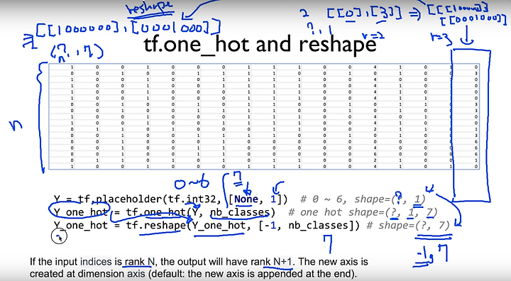 여기서 reshape을 하게 되면 [[1000000, 0001000]]이 되고 shape(?, 7)이 된다. 우리가 원하는 형태이다.