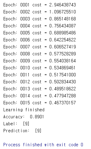 1 2 3 4 5 6 7 8 9 10 11 12 13 14 15 16 17 18 19 20 21 22 23 24 25 26 27 28 29 30 31 32 33 34 35 36 37 38 39 40 41 42 43 44 45 46 47 48 49 50 51 52 53 54 55 56 57 58 59 | import tensorflow as tf import random import matplotlib.pyplot as plt from tensorflow.examples.tutorials.mnist import input_data mnist = input_data.read_data_sets("MNIST_data/", one_hot=True) nb_classes = 10 # MNIST data image of shape 28 * 28 = 784 X = tf.placeholder(tf.float32, [None, 784]) # 0 ~ 9 digits recognition = 10 classes Y = tf.placeholder(tf.float32, [None, nb_classes]) W = tf.Variable(tf.random_normal([784, nb_classes])) b = tf.Variable(tf.random_normal([nb_classes])) hypothesis = tf.nn.softmax(tf.matmul(X, W) + b) cost = tf.reduce_mean(-tf.reduce_sum(Y * tf.log(hypothesis), axis=1)) optimizer = tf.train.GradientDescentOptimizer(learning_rate=0.1).minimize(cost) # Test model is_correct = tf.equal(tf.arg_max(hypothesis, 1), tf.arg_max(Y, 1)) accuracy = tf.reduce_mean(tf.cast(is_correct, tf.float32)) # parameters training_epochs = 15 batch_size = 100 with tf.Session() as sess: sess.run(tf.global_variables_initializer()) for epoch in range(training_epochs): avg_cost = 0 total_batch = int(mnist.train.num_examples / batch_size) for i in range(total_batch): batch_xs, batch_ys = mnist.train.next_batch(batch_size) c, _ = sess.run([cost, optimizer], feed_dict={X: batch_xs, Y: batch_ys}) avg_cost += c / total_batch print('Epoch:', '%04d' % (epoch + 1), 'cost =', '{:.9f}'.format(avg_cost)) print("Learning finished") # Test the model using test sets print("Accuracy: ", accuracy.eval(session=sess, feed_dict={ X: mnist.test.images, Y: mnist.test.labels})) # Get one and predict r = random.randint(0, mnist.test.num_examples - 1) print("Label: ", sess.run(tf.argmax(mnist.test.labels[r:r + 1], 1))) print("Prediction: ", sess.run( tf.argmax(hypothesis, 1), feed_dict={X: mnist.test.images[r:r + 1]})) plt.imshow( mnist.test.images[r:r + 1].reshape(28, 28), cmap='Greys', interpolation='nearest') plt.show() |