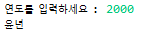 import java.util.*; public class year { public static void main(String args[]) { Scanner scanner = new Scanner(System.in); System.out.print("연도를 입력하세요 : "); int year = scanner.nextInt(); if (year % 400 == 0) { System.out.println("윤년"); return; } if (year % 4 == 0) { if (year % 100 == 0) { System.out.println("평년"); } else { System.out.println("그냥 년"); } } else { System.out.println("그냥 년"); } } }